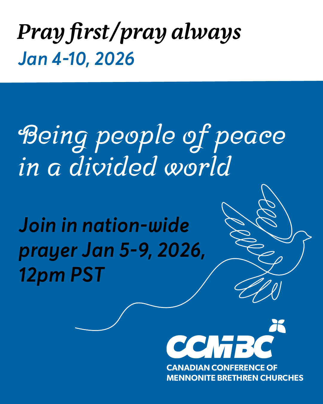 So join us the first week of January as we gather as an MB family across Canada to pray — for peace with God, peace with others, peace in our churches, peace with creation, peace with ourselves, and for peace with the world.